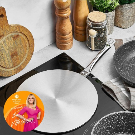 KORZYŚCI Gwarancja równomiernego rozprowadzenia temperatury Szybka absorpcja ciepła Wygoda użytkowania oraz jakość dająca ci pewność wieloletniego wykorzystania podczas gotowania CECHY I ZALETY Konstrukcja w całości wykonana z metalu (z aluminiowym wkładem) Adapter został wyposażony w stalowy uchwyt Możliwość stosowania z garnkami, rondlami, czajnikami i patelniami Uniwersalny adapter na płytę indukcyjną Könighoffer (średnica 24 cm) Posiadany przez ciebie komplet garnków może nadal być użyteczny, jeśli zdecydujesz się na zakup kuchenki indukcyjnej. Wystarczy, że zakupisz odpowiedni adapter akumulacyjny. Produkt ten umieszcza się wprost na płycie, a na nim stawia się wybrane naczynie. Dzięki jego innowacyjnej konstrukcji wytworzone ciepło zostaje w całości przekazane, a ty możesz cieszyć się z szybszego przygotowania posiłku, czy też wrzątku (np. do pierogów).