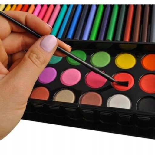 Zawiera aż 72 kredki, 96 mazaków, 60 pasteli olejowych, 18 farb akwarelowych, 3 ołówki, 3 pędzelki z pojemnikiem na wodę, 30 spinaczy biurowych, temperówkę oraz 2 gumki do mazania.