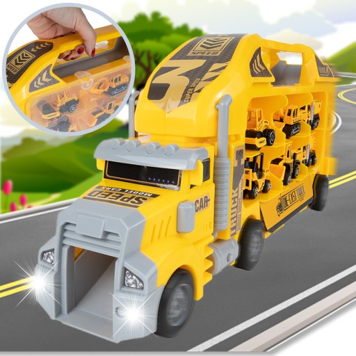 Ogromny Tir Laweta Zjeżdżalnia z Wyrzutnią Autek Walizka + 6 Autek Budowlanych + Światło w Przednich Lampach