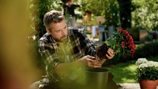 Umieść bryłę korzeniową rośliny w zagłębieniu delikatnie dociskając, tak aby znalazła się poniżej brzegu doniczki.