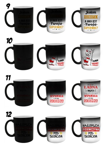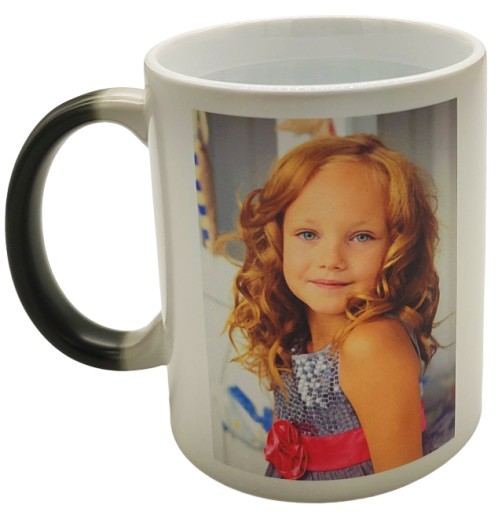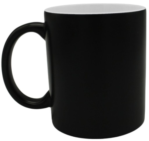 - Gdy kubek jest zimny nadruk jest praktycznie niewidoczny. Po zalaniu gorącym płynem - nadruk powoli staje się widoczny. Po ostygnięciu, kubek ponownie robi się czarny.