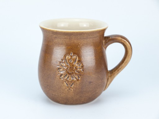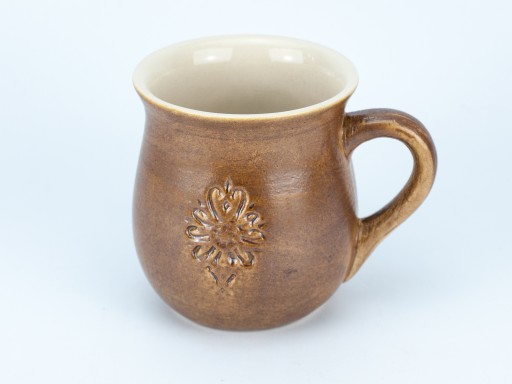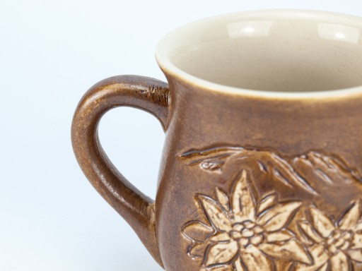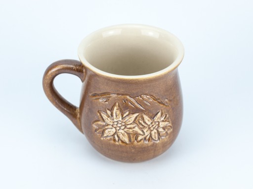 Kubek jest dwustronny: z jednej strony występuje zdobienie z motywem szarotki, z drugiej strony delikatne zdobienie z motywem parzenicy.
