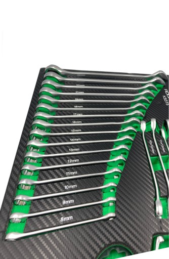 - Kluczy oczkowo-płaskie 16 szt.: 8,9,10,11,12,13,14,15,16,17,18,19,21,22,24,27 mm