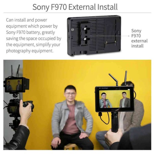 Gdy chcesz użyć bezprzewodowej transmisji wideo to często nie wiesz, gdzie umieścić ją na monitorze. LUT7 PRO wyposażony w zewnętrzny zestaw instalacyjny i zasilający F970 nie tylko rozwiązuje ten problem, ale również może być zasilany z akumulatora Sony F970. Najważniejsze jest to, że dzięki połączeniu monitora i bezprzewodowej transmisji razem, można wygodnie monitorować reżysera i fotografa oraz poprawić efektywność pracy ekipy filmowej.