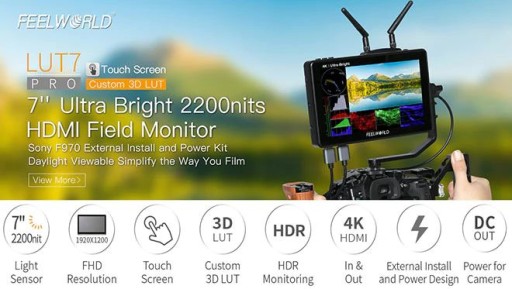 LUT7 PRO marki FEELWORLD to idealny monitor podglądowy do mocowania na aparatach bezlusterkowych i cyfrowych lustrzankach. Ponieważ LUT7 PRO zapewnia pomocnicze wyjście zasilania (DC 8 V); umożliwiając fotografom zasilanie aparatów. Z kablem zasilającym akumulator (opcjonalny), LUT7 PRO wydłuża czas pracy aparatu, zapewniając jednocześnie bardziej użyteczny wyświetlacz.
