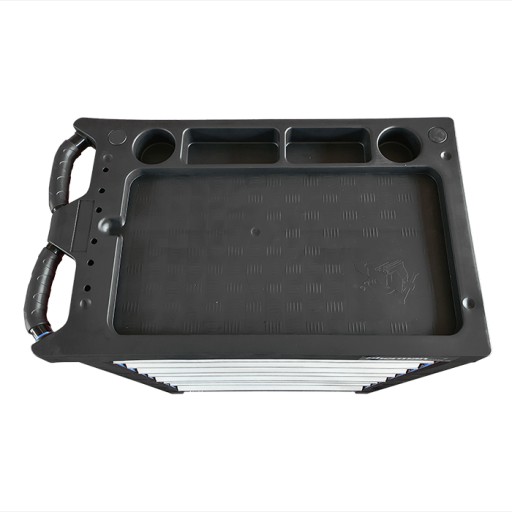 Stalowy wózek z dziewięcioma wysuwanymi szufladami na łożyskach rolkowych. Posiada dwa skrętne koła z hamulcem oraz naroża i blat roboczy wykonany z tworzywa sztucznego.