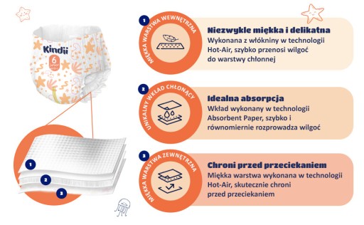Pieluchomajtki od Kindii to innowacyjny produkt na rynku, zapewniający maksymalny komfort Twojemu dziecku. Wewnętrzną oraz zewnętrzną warstwę pieluchomajtek wykonano z włókniny Hot-Air Technology. Technologia ta sprawia, że pieluchomajtki są niezwykle delikatne, oddychające oraz skutecznie chronią przed przeciekaniem.