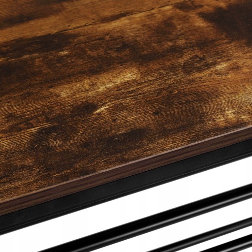 Solidna konstrukcja ze stali malowanej proszkowo z kolorze czarnego matu i laminowana płyta przypominająca postarzany dąb idealnie współgrają, tworząc nowoczesną szafkę na buty. Ta perfekcyjna kombinacja materiałów i wzornictwa nadaje niezwykły charakter temu funkcjonalnemu meblowi.