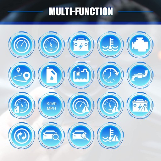 [Wielofunkcyjny miernik] Ten miernik OBD2 jest inteligentnym i potężnym miernikiem wielofunkcyjnym. Jest specjalnie zaprojektowany dla pojazdu bez prędkościomierza, wskaźnika temperatury silnika, termometru olejowego, wskaźnika doładowania i miernika zużycia paliwa, temperatury oleju silnikowego, jak również wyświetlacza czasu.