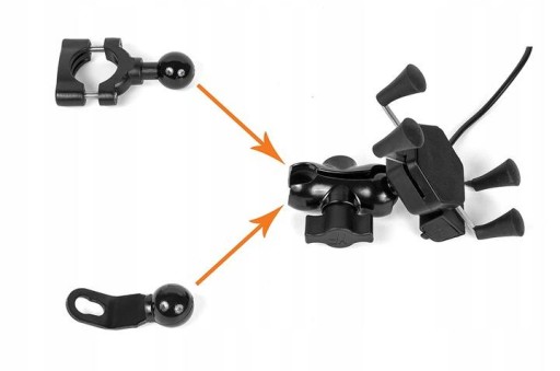 - Uchwyt typu RAM z 4 ramionami zakończonymi gumowymi chwytakami, ładowarką USB, włącznikiem i kablem
