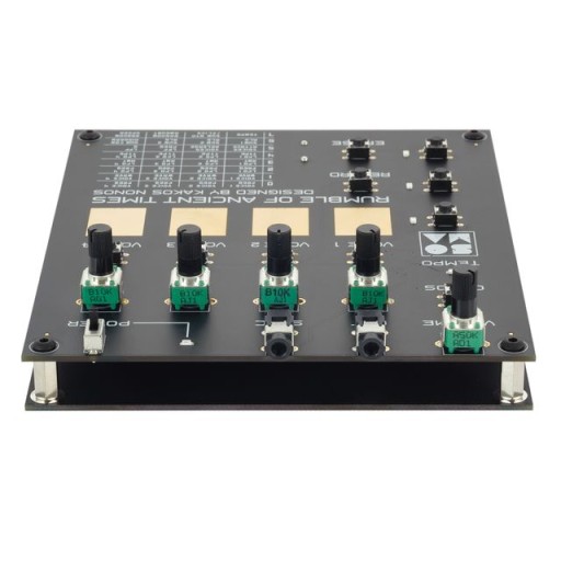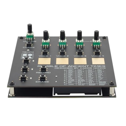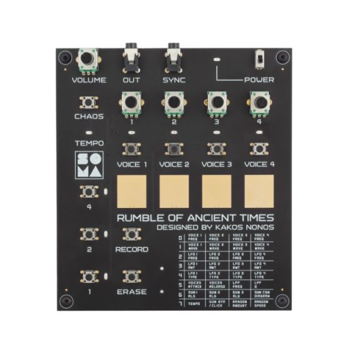 Rumble or Ancient Times firmy Soma to poręczny mini syntezator z mnóstwem uroku lo-fi i dźwięków z czasów, gdy programy mieściły się jeszcze na dyskietkach. Syntezator z 8-bitową generacją dźwięku gener uje szeroką gamę dźwięków, które możesz znać z gier wideo MS-DOS i C64, wiele hałaśliwych rzeczy, ale także bardziej typowe dźwięki syntezatora, które nadają się do kontekstu muzycznego. Dzięki wydajnemu kodowi, "ROAT" nie potrzebuje prawie żadnych zasobów i radzi sobie z procesorem, który w przeszłości był używany w lodówkach lub kuchenkach mikrofalowych. Dlatego też cztery baterie AAA wystarczają na 130 godzin pracy.