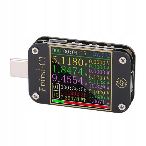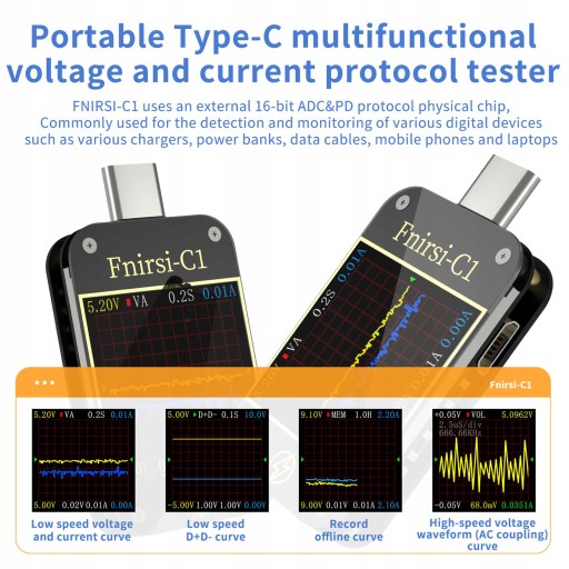Funkcja:1. FNIRSI-C1 ma podwójne interfejsy typu C, jest inteligentny, ma zróżnicowane funkcje, obsługuje test wysokiego prądu 6,5A i działa stabilnie przez długi czas.