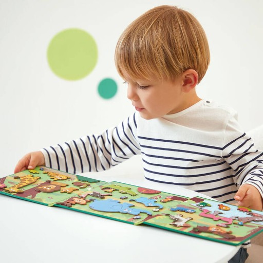Magnetyczne historie Afrykańskie zwierzęta z linii Magneti'stories francuskiej marki Janod zawiera 30 magnesów – dzikich zwierząt, m in. żyrafę, zebrę, słonie, małpkę, krokodyla, flamingi itp., które stanowią części składowe do stworzenia oryginalnej ilustracji na rozkładanej potrójnej planszy. Magnesy pozwalają na układanie wymyślonych przez siebie opowieści, których bohaterami są mieszkańcy dżungli. To świetna rozrywka dla wszystkich twórczych dzieci.