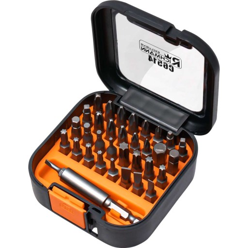Zestaw 34 sztuk bitów płaskich, krzyżakowych, HEX, TORX i kwadratowych.Komplet idealnie sprawdzi się zarówno w profesjonalnych serwisach, warsztatach, jak i u domowych majsterkowiczów.Wykonane ze stali S2 charakteryzuje się wysoką twardością, dobrą wytrzymałością mechaniczną i odpornością na zużycie.W zestawie znajduje się uchwyt magnetyczny 60 mm, dedykowany pod standardowe bity ¼” (6,35 mm).Całość została umieszczona w specjalnej kasetce z tworzywa sztucznego z dedykowanym miejscem na każdy element.Etui zostało wyposażone w klips umożlwiający przypięcie do paska.Jakość premium.