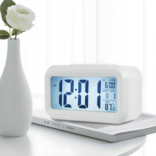 BUDZIK Z ZEGAREM LED I TERMOMETREM, Z PODŚWIETLENIEM 12/24H To nowoczesny budzik elektroniczny, który nie tylko pokazuje czas, ale także mierzy temperaturę, wyświetla kalendarz i posiada funkcję alarmu.
