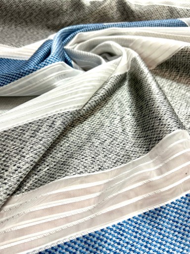 Przedmiotem sprzedaży tkanina w szerokie pasy w kolorach białych , szarych oraz błękitnych melanży rozdzielona dekoracyjnymi przezroczystymi paskami o szerokości około 5 cm , dodatkowe cieniutkie paseczki wyczuwalne są w dotyku. Pasy biegną poziomo .