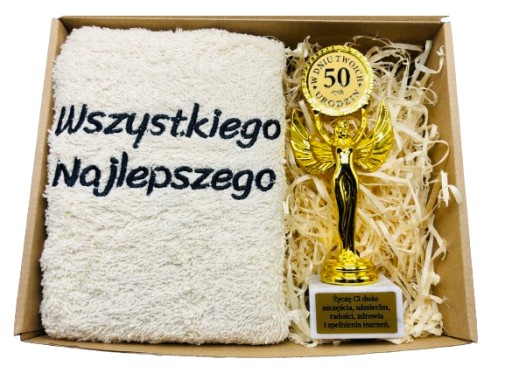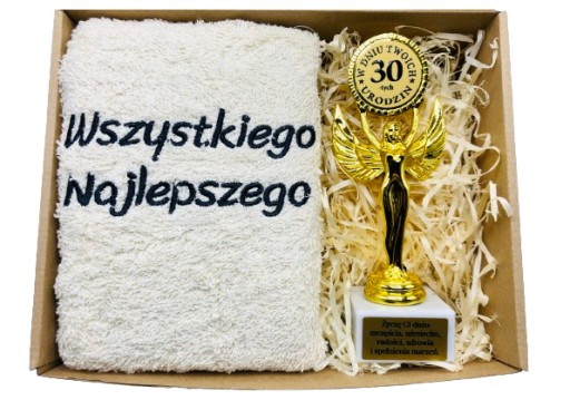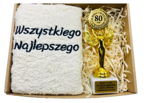 ✅ Zestaw zawiera Ręcznik z Haftem i Statuetka Urodzinowa