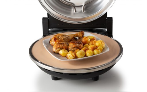 Piec do pizzy, moc 1200 W, 5 poziomów pieczenia (I 120?C, II 180?C, III 260?C, IV 340?C, V 400?C), szybkie nagrzewanie, żaroodporny ceramiczny kamień niepodatny na zabrudzenia, timer z sygnałem dźwiękowym, czas pieczenia świeżej pizzy 4 min, czas pieczenia mrożonej pizzy 3 min, średnica wewnętrzna 30 cm, wymiary 34x30x19 cm