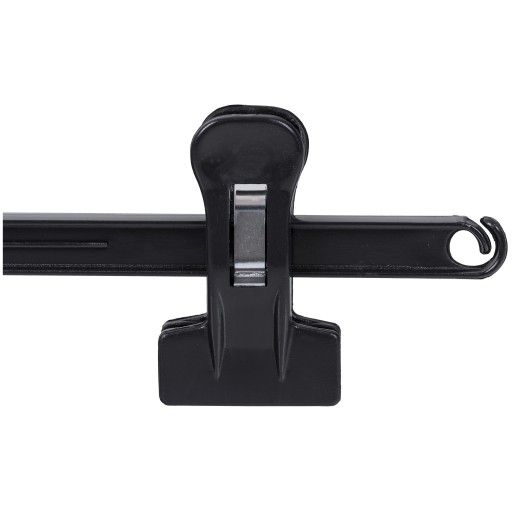 Regulowana na długość belki klamra z wewnętrznie umocowanymi gumkami zapobiegającymi zsuwaniu się odzieży.