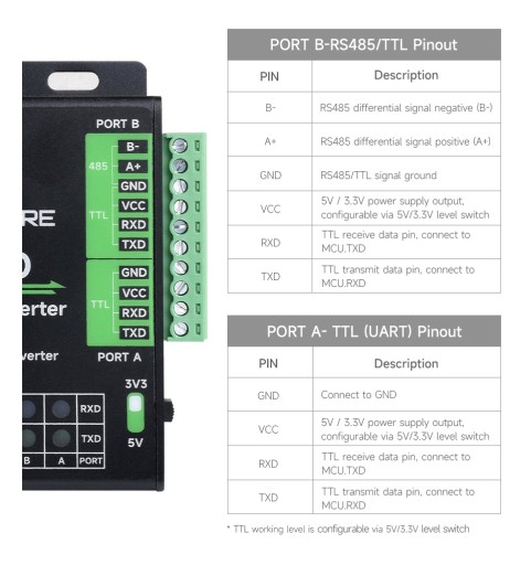 - Zintegrowany translator poziomów napięciowych TTL serial 3.3V/5V, konfigurowany przełącznikiem.