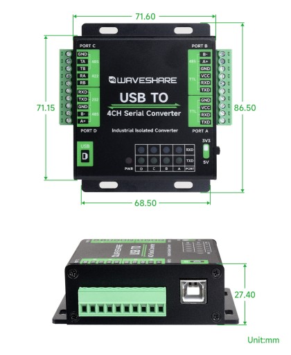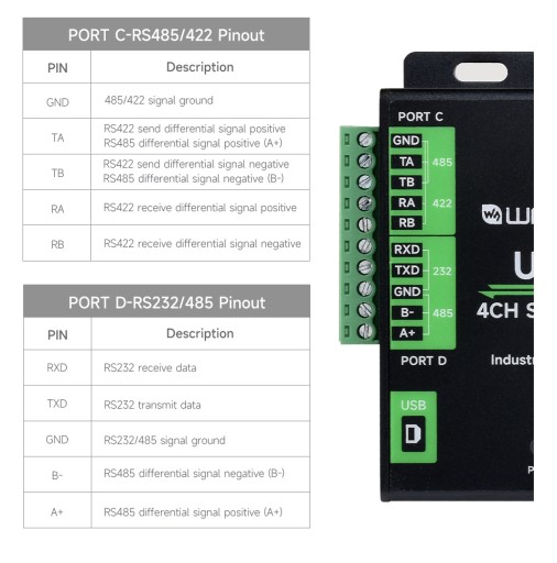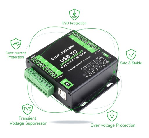 Obsługuje USB do 4-kanałowego, wielofunkcyjnego portu szeregowego, co ułatwia rozszerzanie lub debugowanie różnych urządzeń przemysłowych z portem szeregowym. Obsługuje USB do 1-kanałowego TTL + 1-kanałowego TTL/RS485 + 1-kanałowego izolowanego RS485/422 + 1-kanałowego izolowanego RS232/485.