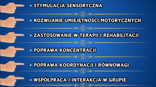 - Terapia: Wykorzystywany przez terapeutów zajęciowych w celu pracy z dziećmi z zaburzeniami rozwojowymi, integracji sensorycznej oraz potrzebami specjalnymi.