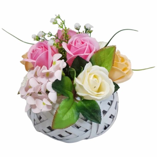 Na sprzedaż oferujemy kompozycję kwiatową - bukiet z kwiatami mydlanymi, które nie tylko udekorują wnętrze, ale również zapełnią je delikatnym i przyjemnym zapachem. Kompozycja została wykonana z wysokiej jakości materiałów, co gwarantuje trwałość i estetyczny wygląd.