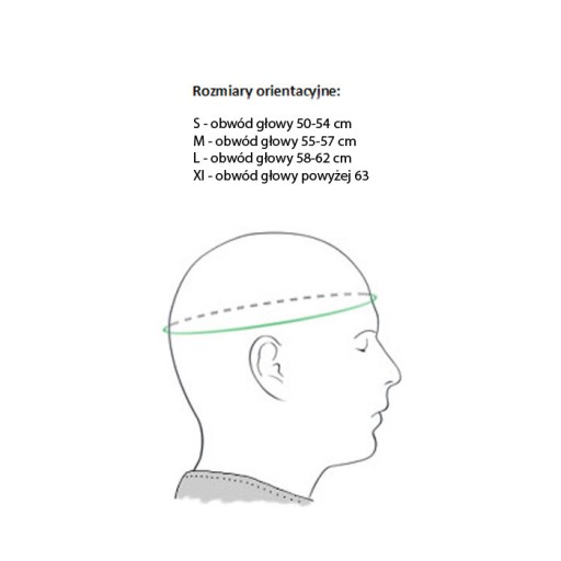 TABELA ROZMIARÓW(obwód głowy):S (50-54 cm), M (55-57 cm), L (58-62 cm), XL (powyżej 63 cm)