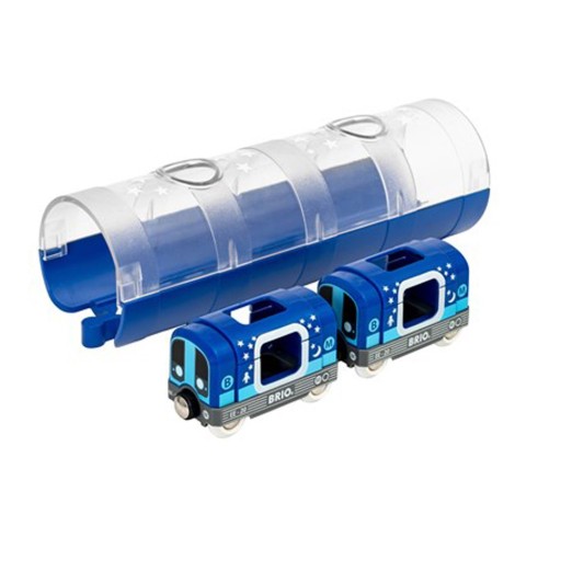 Zestaw świecący w ciemności Metro z tunelem 33970 zawiera dwuczęściowy pociąg metra oraz specjalnie zaprojektowany tunel. Fluorescencyjne elementy pociągu świecą swym blaskiem w tunelu, a na dachu pojawiają się błyszczące gwiazdki! Na pokładzie można przewieźć dwie figurki. Lokomotywę oraz wagon pasażerski można łączyć ze sobą oraz innymi zestawami Brio za pomocą magnesów. Tunel został zaprojektowany tak, aby stanowił jednocześnie pomysłowe opakowanie. Przez przezroczysty dach można obserwować jaki pociąg właśnie przejeżdża. Dodatkowo tunel posiada funkcję łatwego dostępu, zapobiegającą potencjalnym blokadom. Wszystkie tory i dodatkowe elementy Brio dostosowane są do rozbudowywania systemu, kompatybilne są również z drewnianymi torami innych producentów. Dodatkowe elementy pozwolą tworzyć nowe, ciekawe trasy dla pociągów i lokomotyw, aby zabawa ulubionymi kolejkami nie miała końca. Pozostałe zestawy sprzedawane oddzielnie.
