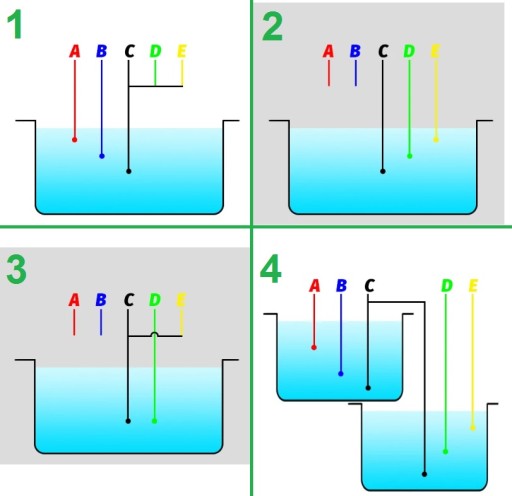 Sondę C rozdzielamy na 2 sztuki i umieszczany na dnie wyższego jak i niższego zbiornika. Sonda A oznacza poziom wyższy a sonda B poziom niższy górnego zbiornika. Analogicznie sonda E oznacza poziom wyższy a sonda D poziom niższy dolnego zbiornika.