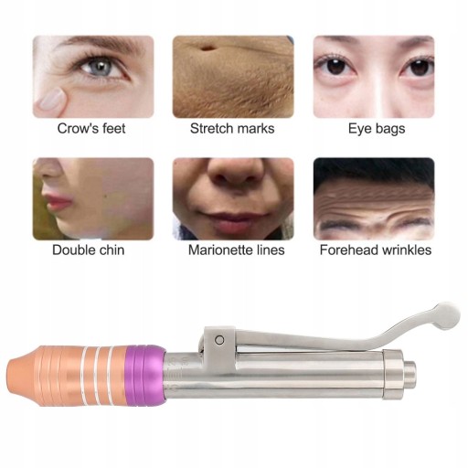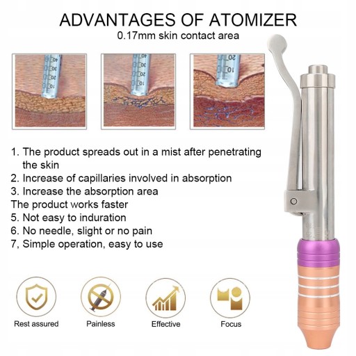 Wysokie ciśnienie jest generowane przez urządzenie ciśnieniowe, a ciecz jest wypychana z przednich górnych mikrootworów, tworząc ultra-drobną kolumnę cieczy o grubości 0,17 mm, która natychmiast przenika przez skórę do tkanki podskórnej, aby uzyskać efekt usuwania zmarszczek .