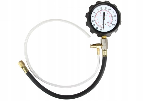 Zestaw zawiera adaptery i kształtki pasujące do większości układów wtrysku paliwa. Manometr z podwójną skalą: 0 - 140 psi oraz 0 - 10 bar.