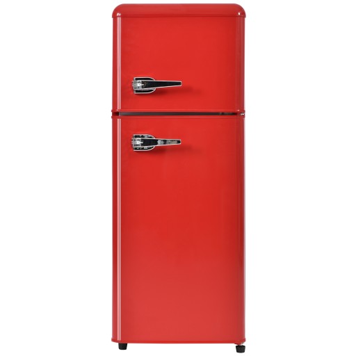Lodówka retro. Lodówko-zamrażarka, wysokość 105,5 cm, szerokość 41 cm, dwudrzwiowa, pojemność całkowita 92 litry, pojemność zamrażarki 28 litrów. Półki na drzwiach i półki szklane. 181 kWh/rok, -27°C ~13°C, oświetlenie LED.