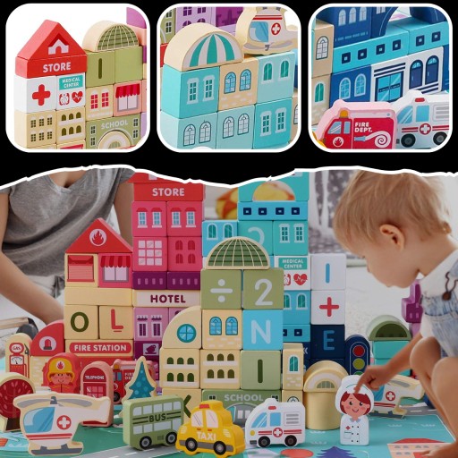 Zabawka, jaką są klocki drewniane miasto, to wiele godzin niesamowitej zabawy dla najmłodszych. Zestaw jest bardzo duży – w jego skład wchodzi aż 100 różnego rodzaju klocków. Z klocków można układać różnego rodzaju budynki mieszkalne oraz budynki użyteczności publicznej, ponadto zestaw obejmuje również elementy takie jak drewniane pojazdy, budynki, drzewka a nawet ludzie. Wszystko to sprawia, że edukacyjne klocki miasto to bardzo realistyczna zabawka, która zawsze wygrywa z nudą.