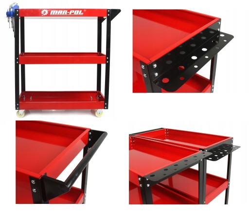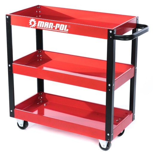 Stalowy wózek z trzema półkami. Idealnie nadaje się do warsztatów, serwisów, a także jest dobrym rozwiązaniem dla majsterkowicza. Ułatwia pracę, gdyż każde narzędzie masz zawsze pod ręką. Wyposażony został w cztery kółka dwa stała i dwa skrętne oraz metalową rączkę co ułatwia jego poruszanie. Wózek może służyć również do transportu niewielkich paczek.
