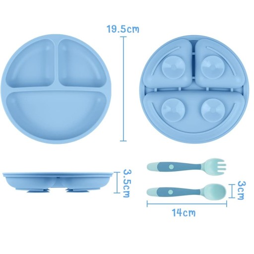 Talerz dla niemowląt jest podzielony na 3 przegródki o wymiarach 19,5 x 19,5 cm, co pomaga zapewnić dzieciom zrównoważoną dietę i różnorodność smaków. Dodatkowo, kształt uśmiechniętej twarzy przyciąga uwagę dziecka i zachęca je do jedzenia.