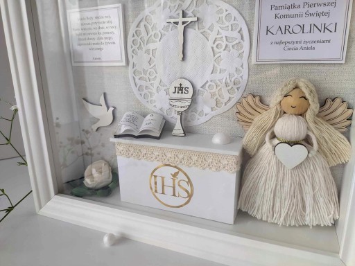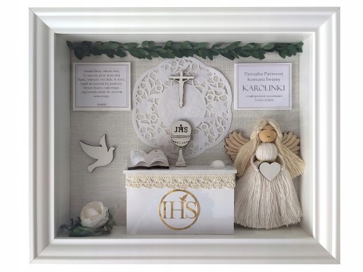 RAMKA 3D KOMUNIA ŚWIĘTA Z ANIOŁKIEM MAKRAMA PAMIĄTA PIERWSZEJ KOMUNII ŚW.