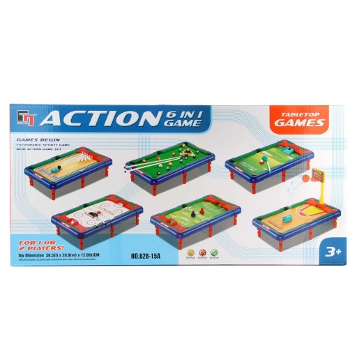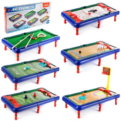 Zestaw gier stołowych 6 w 1, dzięki którym możemy zagrać w 6 różnych gier sportowych, nie tylko w pomieszczeniu, ale także na świeżym powietrzu. Zabawka z wymiennymi planszami i akcesoriami, dzięki którym możemy zagrać w 6 różnych gier.