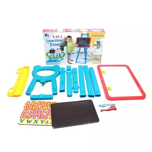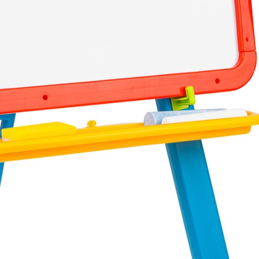 Umieszczone u góry specjalne zaciski umożliwiają zawieszanie kartek. Tablica wyposażona jest w: półeczkę na przybory do rysowania, kredę i kolorowe literki z magnesami bardzo przydatne przy nauce pisania i czytania.
