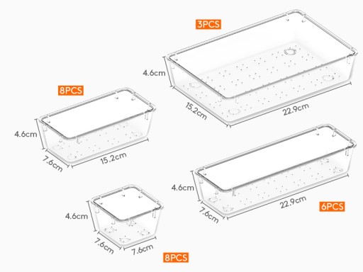 Elastyczność i różnorodność rozmiarów: Dostajesz 25 organizatorów w 4 różnych rozmiarach, co oznacza, że masz pełną kontrolę nad tym, jak dostosować swoją przestrzeń do przechowywania. To produkty, które dostosujesz do swoich potrzeb.