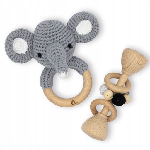 Nowa zabawka dla Twojego maluszka - GRZECHOTKA I GRYZAK DLA DZIECI SŁONIK! Ten uroczy zestaw składa się z drewnianej grzechotki i gryzaka w kształcie słonia. To nie tylko idealna zabawka, ale także wsparcie dla rozwoju motorycznego i sensorycznego Twojego dziecka.