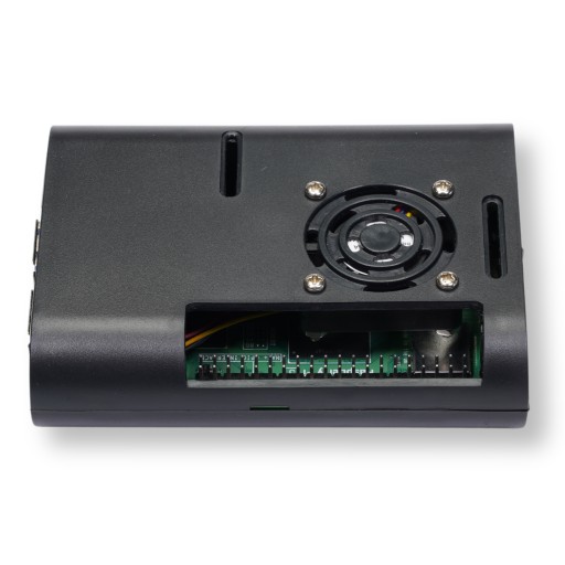 Czarna obudowa z tworzywa sztucznego, stworzona specjalnie dla minikomputera Raspberry Pi 5, składa się z dwóch łatwych do zmontowania części. Montaż odbywa się przy użyciu dołączonych śrubek, co umożliwia szybkie składanie i rozkładanie. Komplet zawiera również przycisk do zasilania i wentylator chłodzący, zapewniający odpowiednią termoregulację, oraz wszystkie niezbędne śruby do złożenia obudowy.