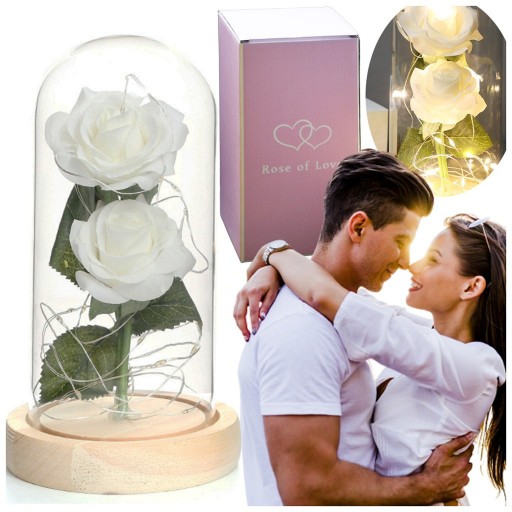 Biała PODWÓJNA sztuczna róża, dwie róże wyglądające jak prawdziwe w kopule szklanej, z oświetleniem LED.
