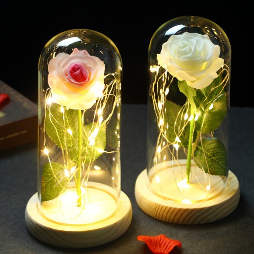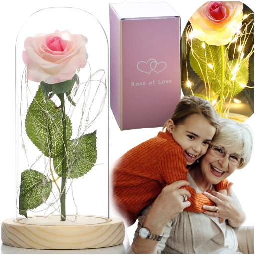 Ta wyjątkowa róża, będąca symbolem miłości, nigdy nie straci swojego uroku. Jej delikatność ukryta pod szklaną kopułą przetrwa z upływem czasu. Gdy zapadnie noc, rozświetlają ją magiczne światełka LED, otaczając ją tajemniczym blaskiem, tworząc intrygujący klimat.