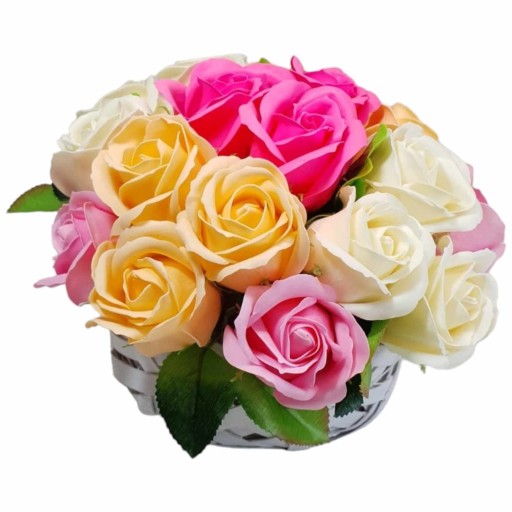 Na sprzedaż oferujemy kompozycję kwiatową - bukiet z kwiatami mydlanymi, które nie tylko udekorują wnętrze, ale również zapełnią je delikatnym i przyjemnym zapachem. Kompozycja została wykonana z wysokiej jakości materiałów, co gwarantuje trwałość i estetyczny wygląd.