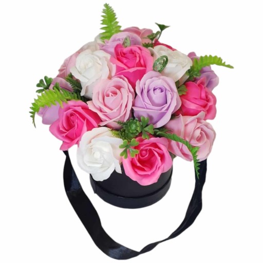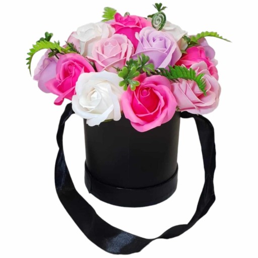 Flower Box bukiet w okrągłym czarnym pudełku z mydlanymi różami łączy piękno kwiatów z ich praktycznym zastosowaniem. Elegancka kompozycja zawiera róże mydlane w odcieniach różu, lila i bieli, pięknie kontrastującym z czarnym pudełkiem. Flower Box z mydlanymi różami doskonale nadaje się na upominek wręczany przy różnorodnych okazjach, szczególnie tych o charakterze romantycznym. Ta wyjątkowa kompozycja z pięknymi mydełkami w realistycznym kształcie róż na pewno spodoba się wszystkim miłośnikom rzeczy eleganckich, a zarazem subtelnych.