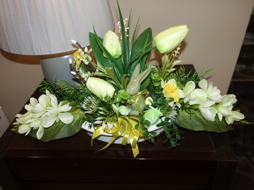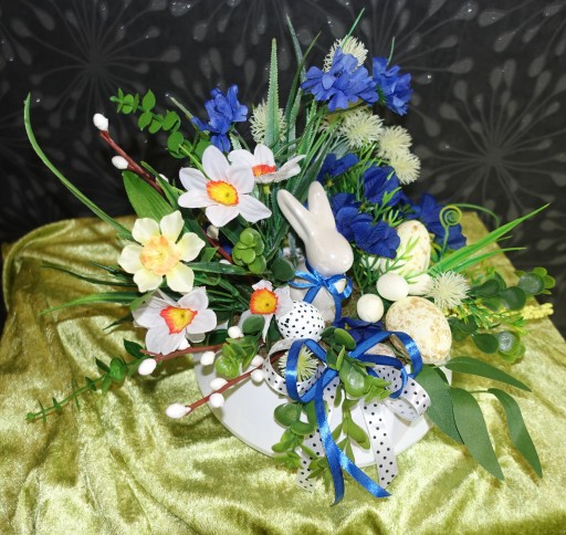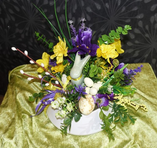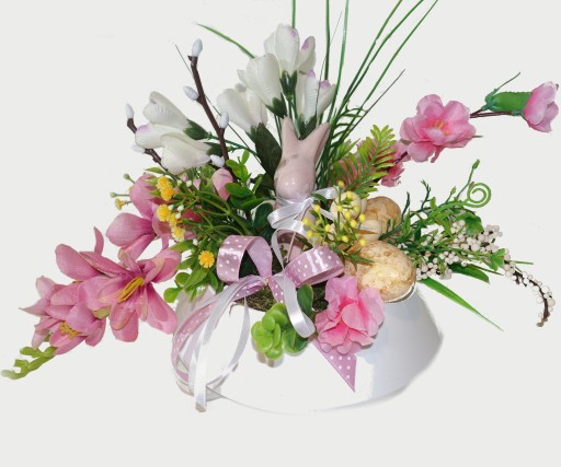 Oferowana kompozycja jest bardzo solidnie i starannie wykonana z dbałością o każdy detal w naszej pracowni florystycznej w Polsce. Dzięki swej oryginalności i subtelności przyciąga wzrok innych i będzie uroczą, .trwałą ozdobą wnętrza a także trwałym, ładnym prezentem na lata albo akcentem wielkanocnym na grobie bliskiej osoby.