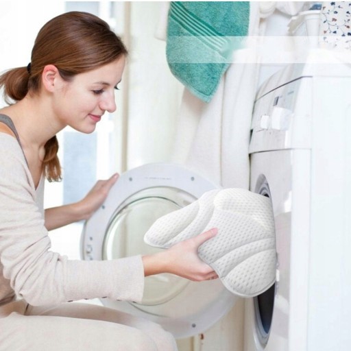 Oddychający materiał poduszki do kąpieli jest bardzo wygodny do czyszczenia po użyciu. Wystarczy umieścić go w zimnej wodzie i delikatnie umyć po użyciu, nie trzeba prasować, pozostawić do wyschnięcia na powietrzu. Poduszka do kąpieli ma haczyki, dzięki czemu można ją zawiesić na wieszaku na ręczniki w wannie lub pod prysznicem w celu szybkiego i łatwego suszenia powietrzem.