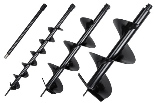 Całość zestawu dopełniają 3 wiertła o długości 80cm oraz o średnicach 10, 20 i 30 cm. Dołączona jest również przedłużka o długości 50cm.
