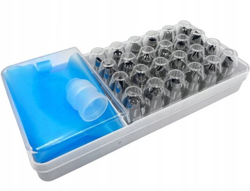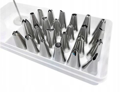 - Zestaw 24 końcówek do dekoracji z rękawem silikonowym i adapterem.